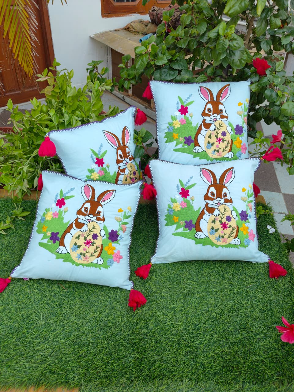 Be the first to review “Handmade Embroidered Bunny Cushion Cover with Tassels | Decorative Sofa Pillow for Living Room & Kids Room (16×16 Inch)” Cancel reply